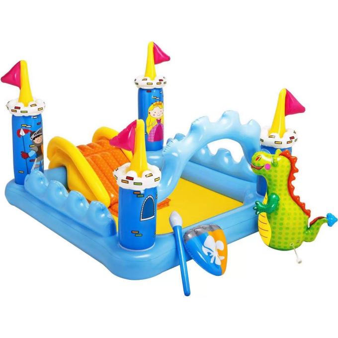 Надувной игровой центр с горкой Intex "Замок" имеет интересную конструкцию и уникальный дизайн в виде средневекового замка. Он рассчитан на детей возрастом от 2 лет и способен вместить целую компанию друзей, которые весело проведут время, придумывая разнообразные игры. Этому способствует наличие оригинальных аксессуаров и надувных фигурок. Стенки изделия выполнены из силикона толщиной 0,3 мм, что обеспечивает ему долговечность и надежность. В сложенном виде бассейн весит всего 5 кг и имеет компактные габариты, что позволяет брать его с собой на пикник или на дачу.